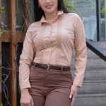 la basta: doble doblez. Aplique manual de placa de marca. Silueta de prenda “entallada”.